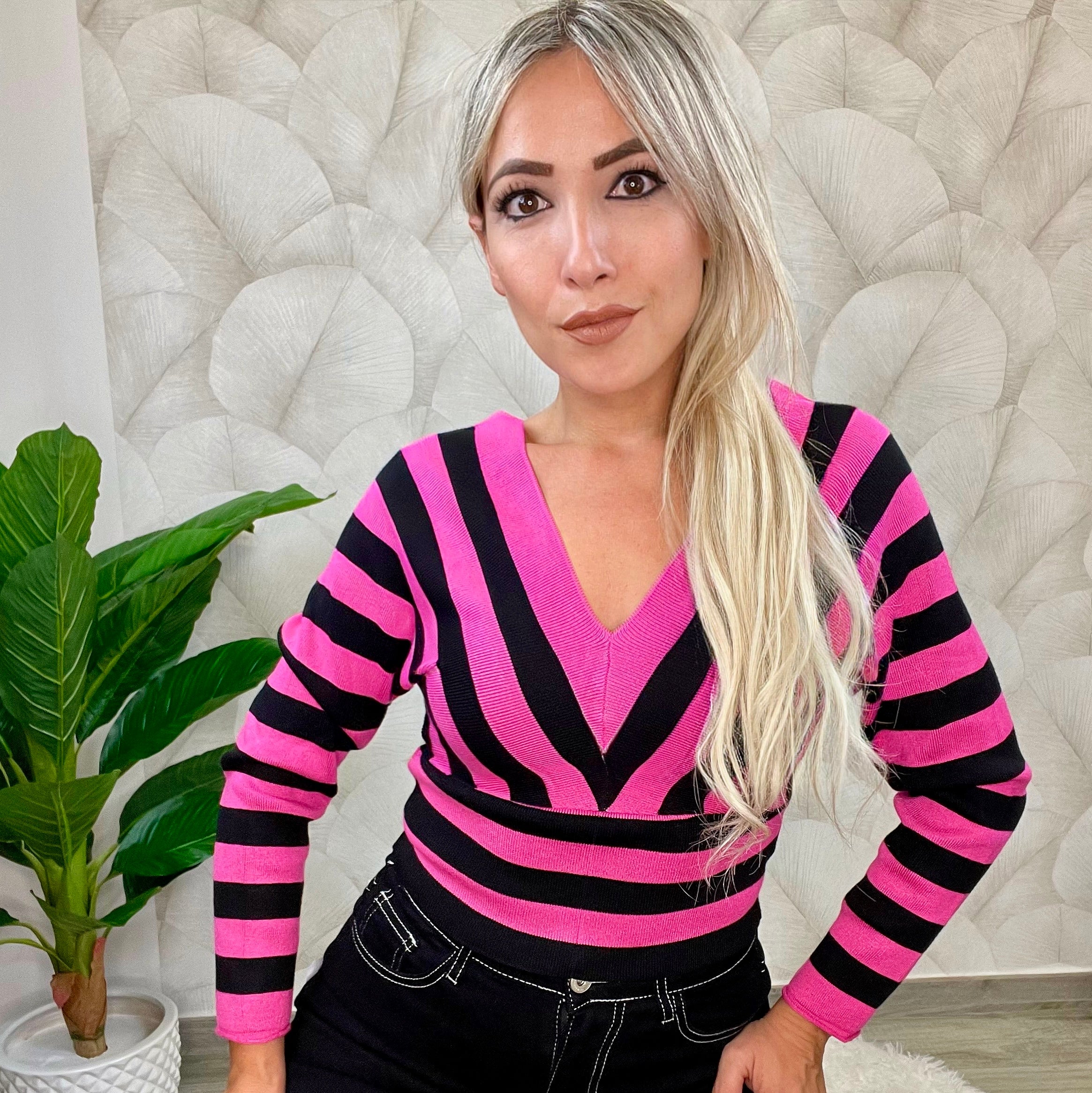 La Maglia in viscosa morbida presenta una fantasia a righe, maniche leggermente a pipistrello, uno scollo a punta davanti e dietro e una taglia unica che veste bene fino alla L.