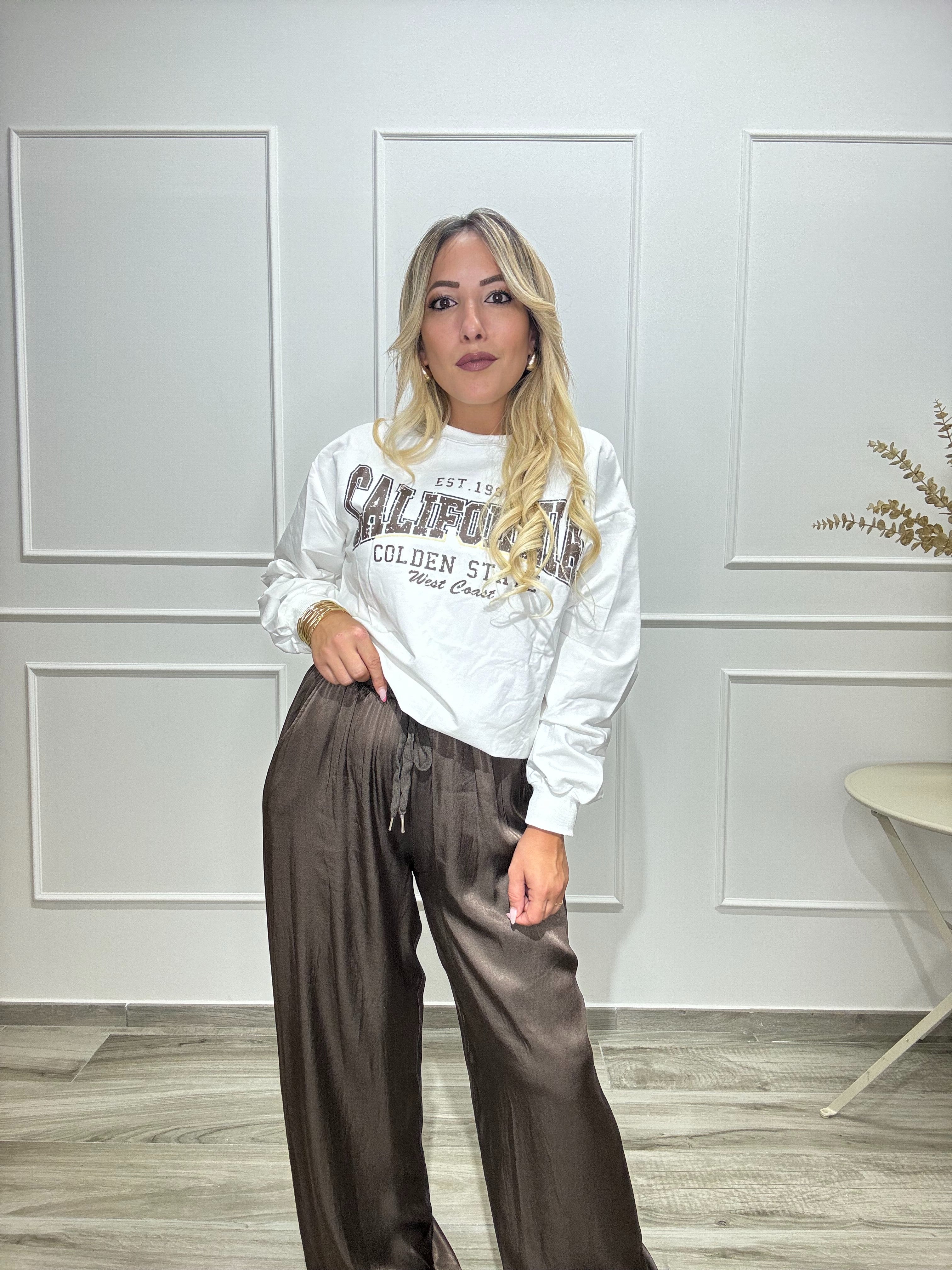 Felpa in cotone elasticizzato con stampa sul davanti, disponibile in taglia unica ma con un ottima vestibilità dalla XS alla XL. La modella in foto veste tg. S