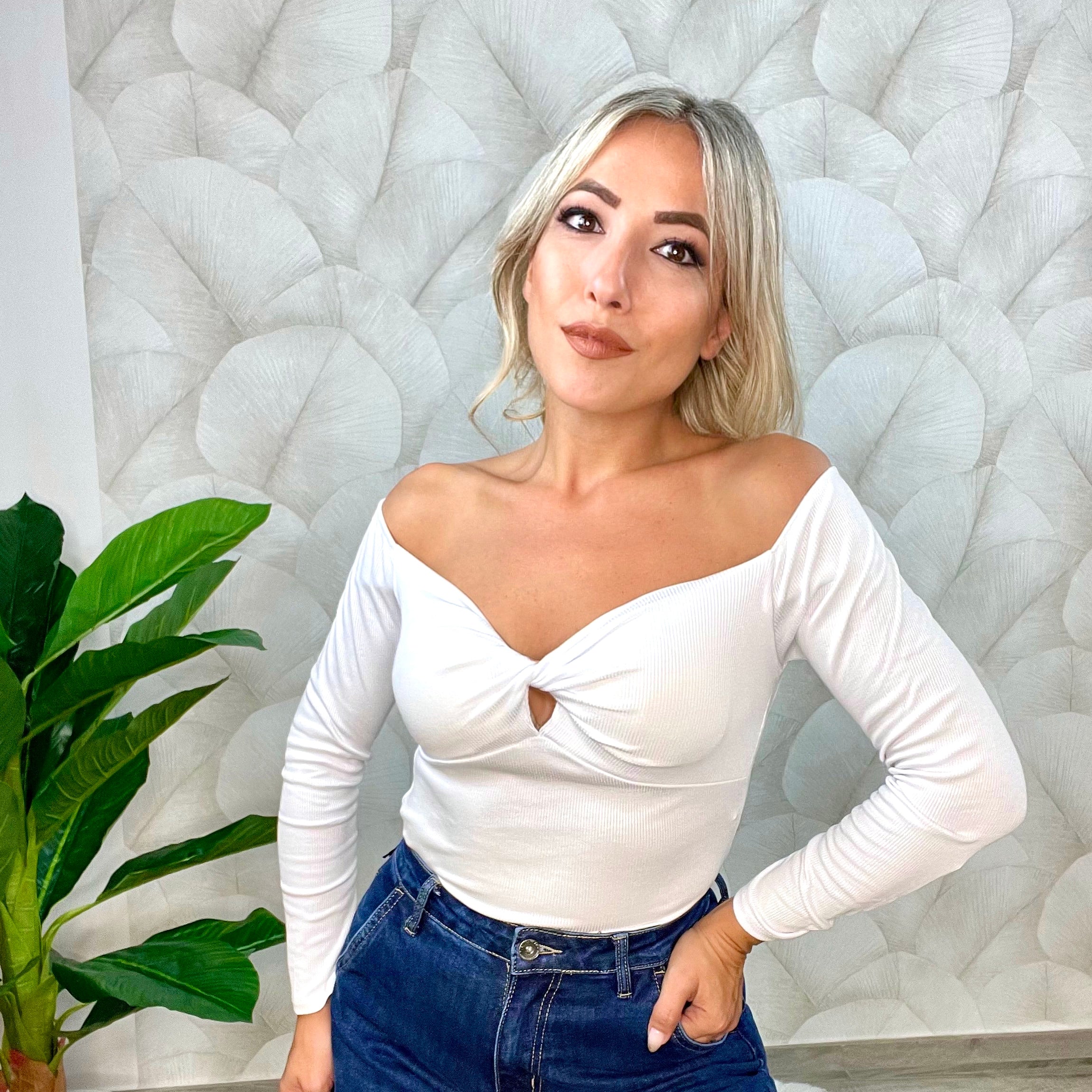 Maglia di cotone a costina con nodo sulla parte anteriore e scollo a barca, disponibile in taglia unica, offre un'ottima vestibilità dalla taglia XS fino alla L.