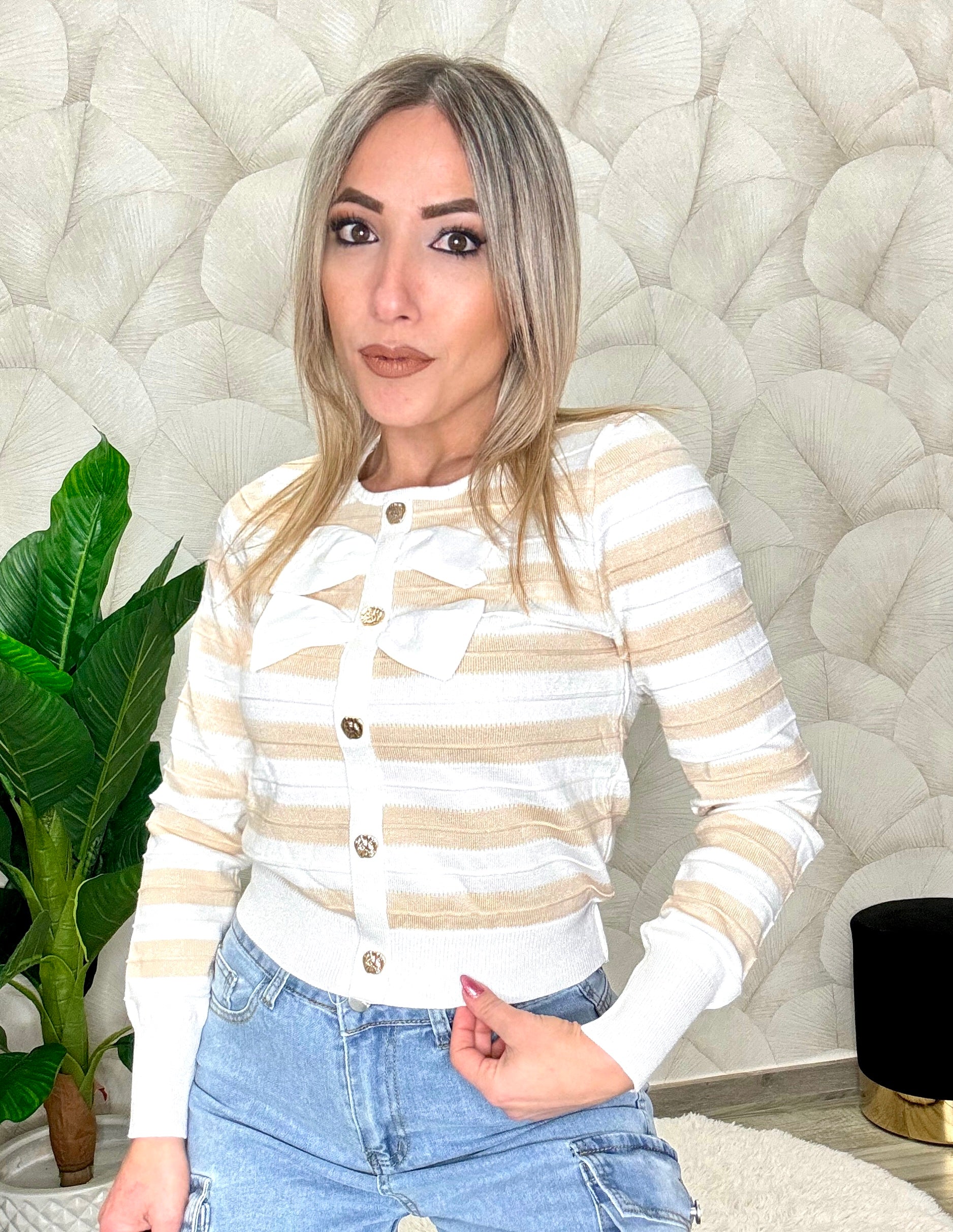 Maglioncino in viscosa con fiocchi applicati sul davanti e bottoncini dorati. Disponibile in taglia unica ma con un ottima vestibilita dalla Xs alla L. La modella in foto veste tg S ed è alta 165 cm