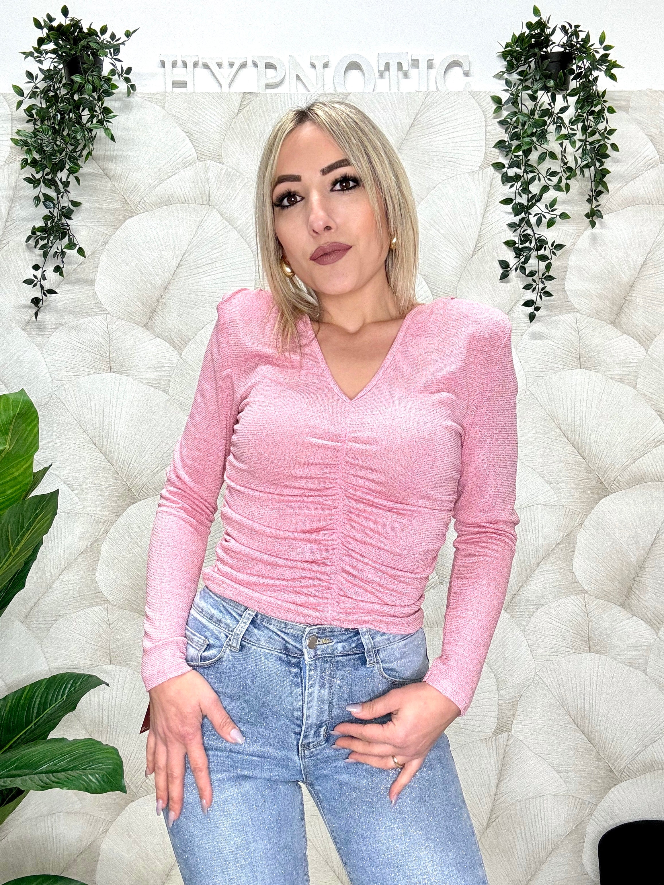 Maglia tessuto laminato, scollo a punta con drappeggi e spalline. Disponibile in taglia unica ma con un ottima vestibilità dalla Xs alla L. La modella in foto veste tg. S ed è alta 165 cm.