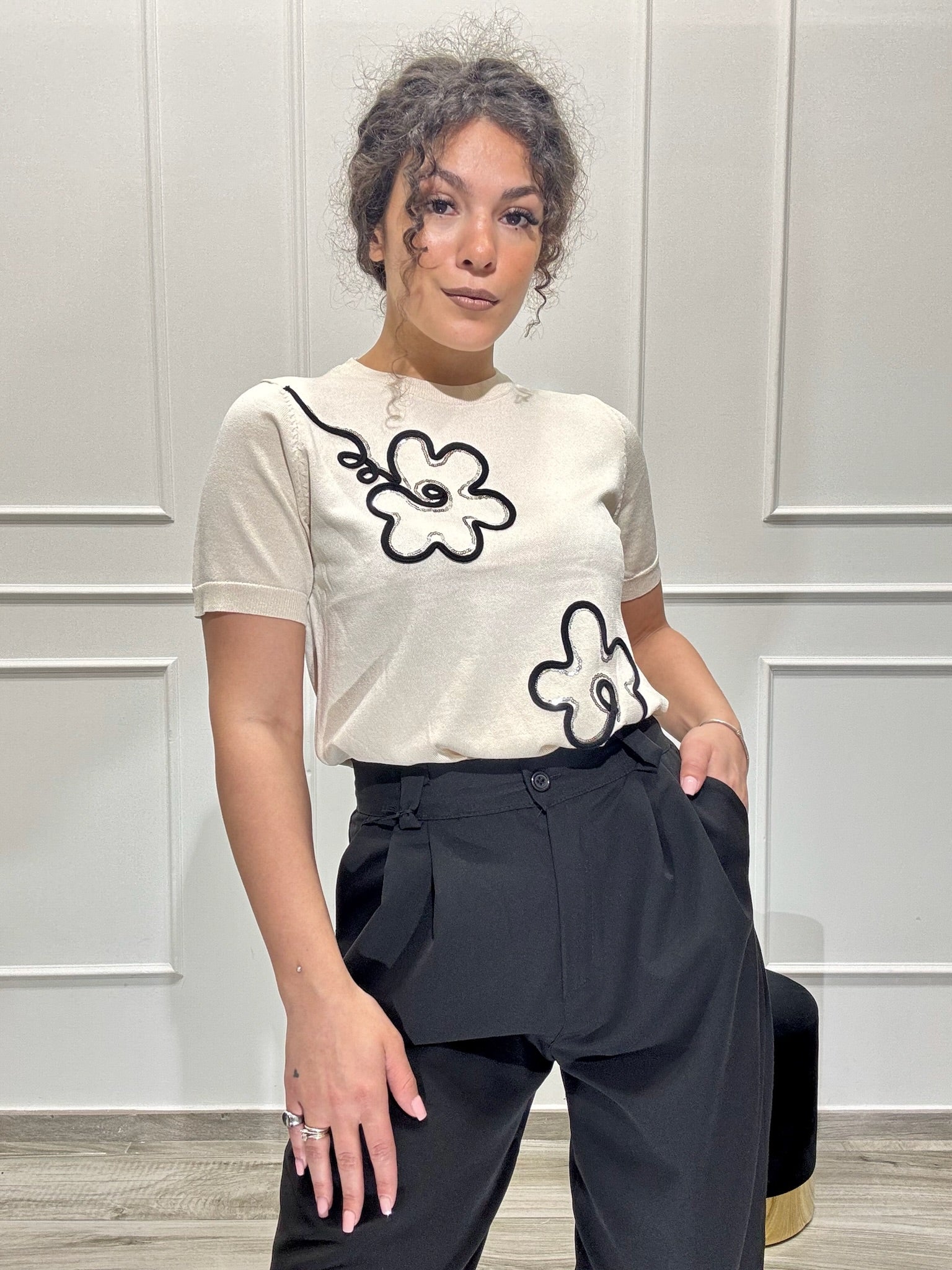 Maglia in cotone con fiori e paillettes ricamati sul davanti, tessuto elastico