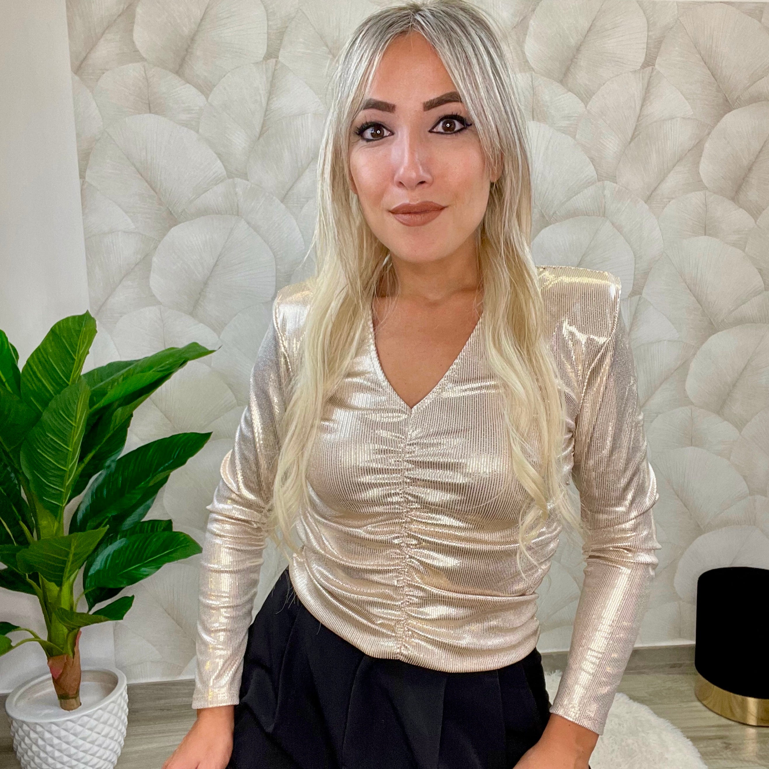 Maglia laminata, arricciata con spalline, scollo a punta e fino alla taglia L offre una vestibilità eccellente.