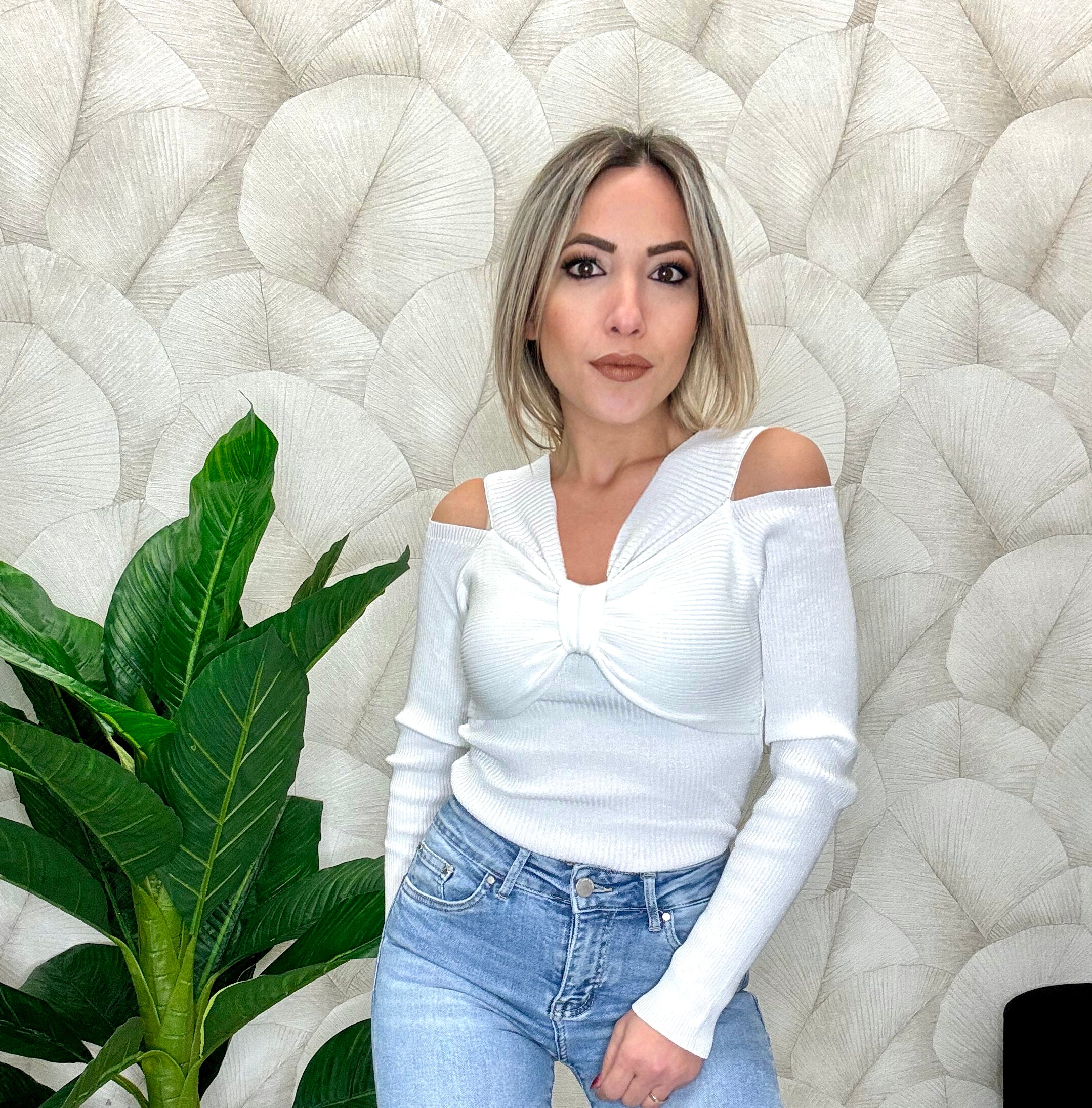Maglia a costine in viscosa estremamente elastica, caratterizzata da apertura sulle spalle e finto fiocco sul davanti, disponibile in taglia unica ma si adatta perfettamente dalla Xs alla L. La modella in foto veste tg. S
