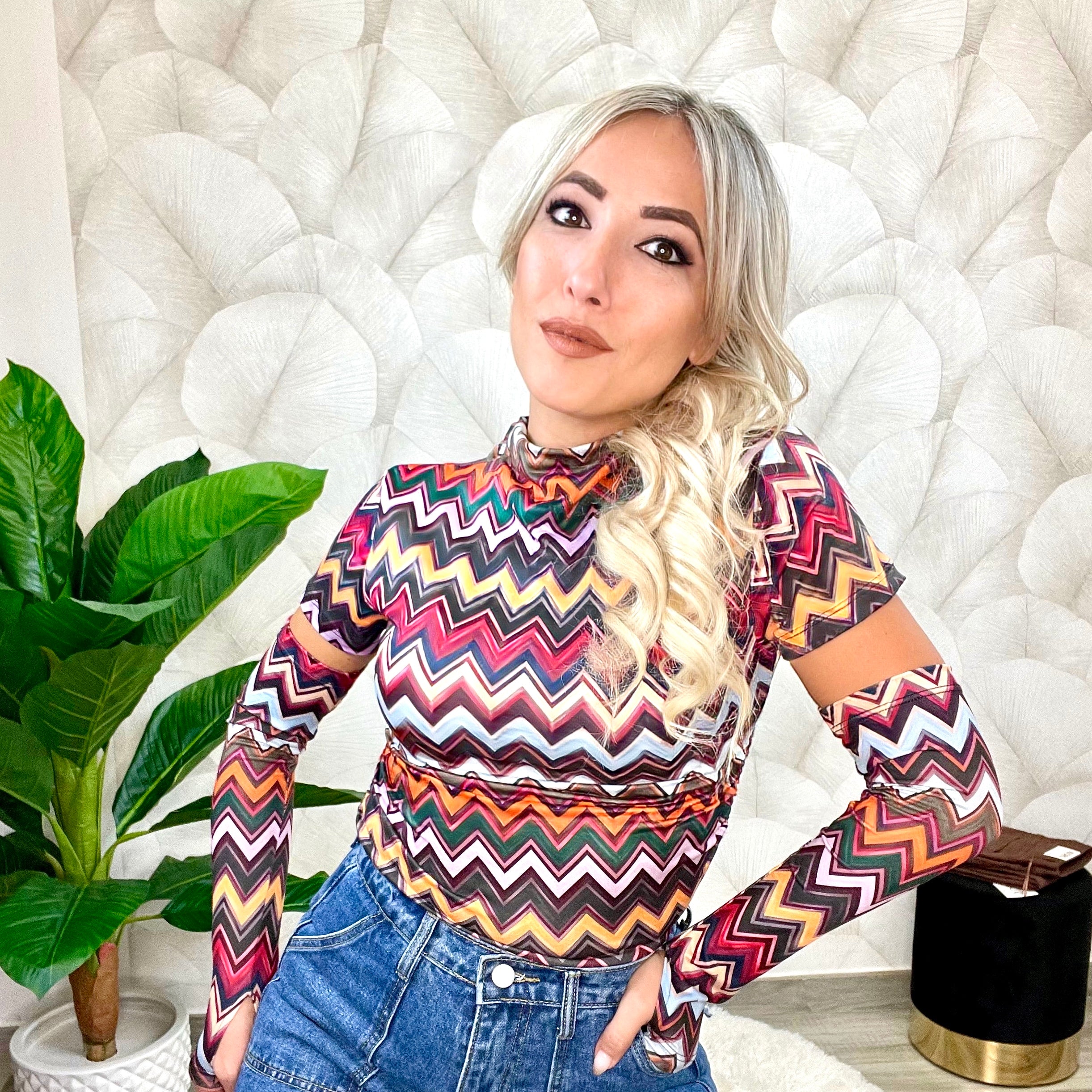 Maglia a mezzo collo con manicotti e drappeggio laterale in tessuto elastico, con perfetta vestibilità da XS a L.