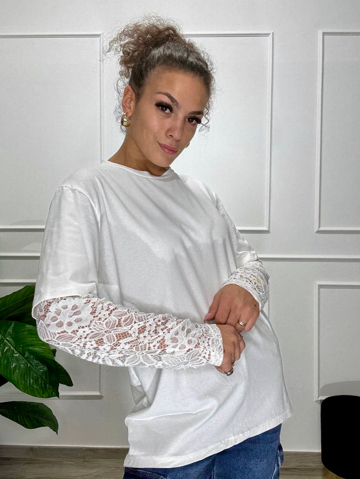 Maglia in cotone con manica in pizzo, modello oversize, vestibilità fino alla XXL. La modella in foto veste XS ed è alta 160 cm