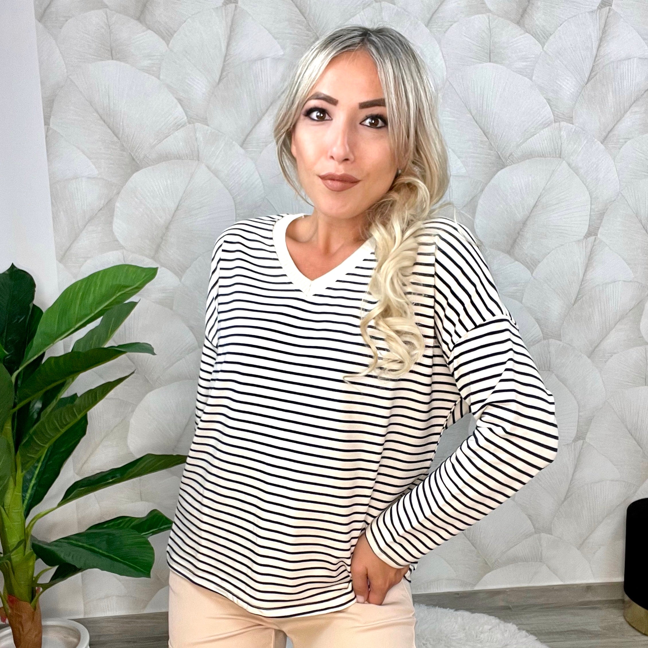 Maglia con colletto a punta realizzata con cotone e viscosa disponibile in una taglia unica che si adatta dalla S alla XL. La stampa a righe all-over conferisce un ulteriore tocco di stile.