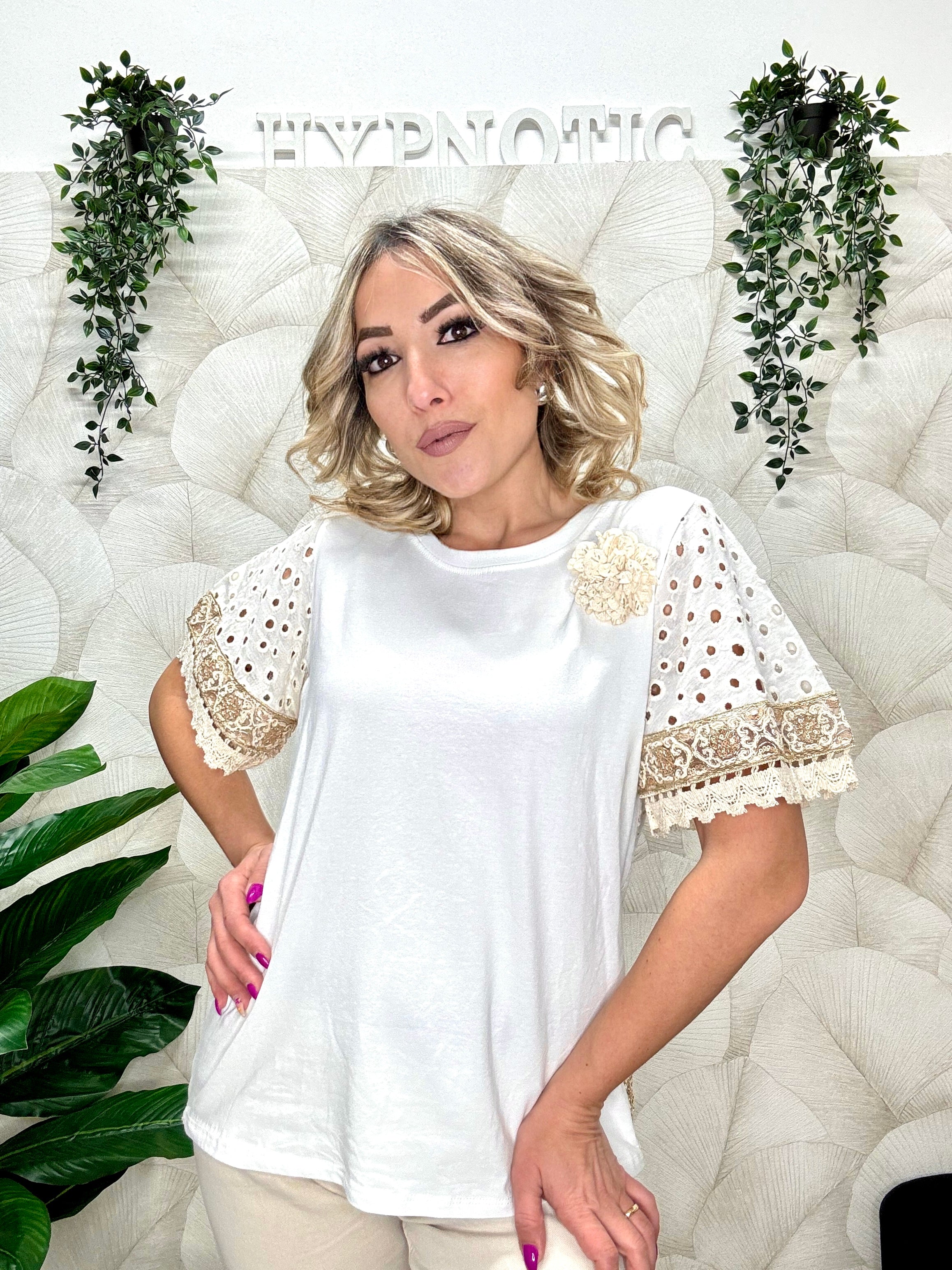 Maglia stile shabby chic 100% cotone, spilla a fiore rimovibile, il dietro interamente in pizzo e decoro ai bordi con paillette. Taglia unica ma con un ottima vestibilita dalla S alla XL. La modella in foto veste tg. S ed è alta 165 cm.