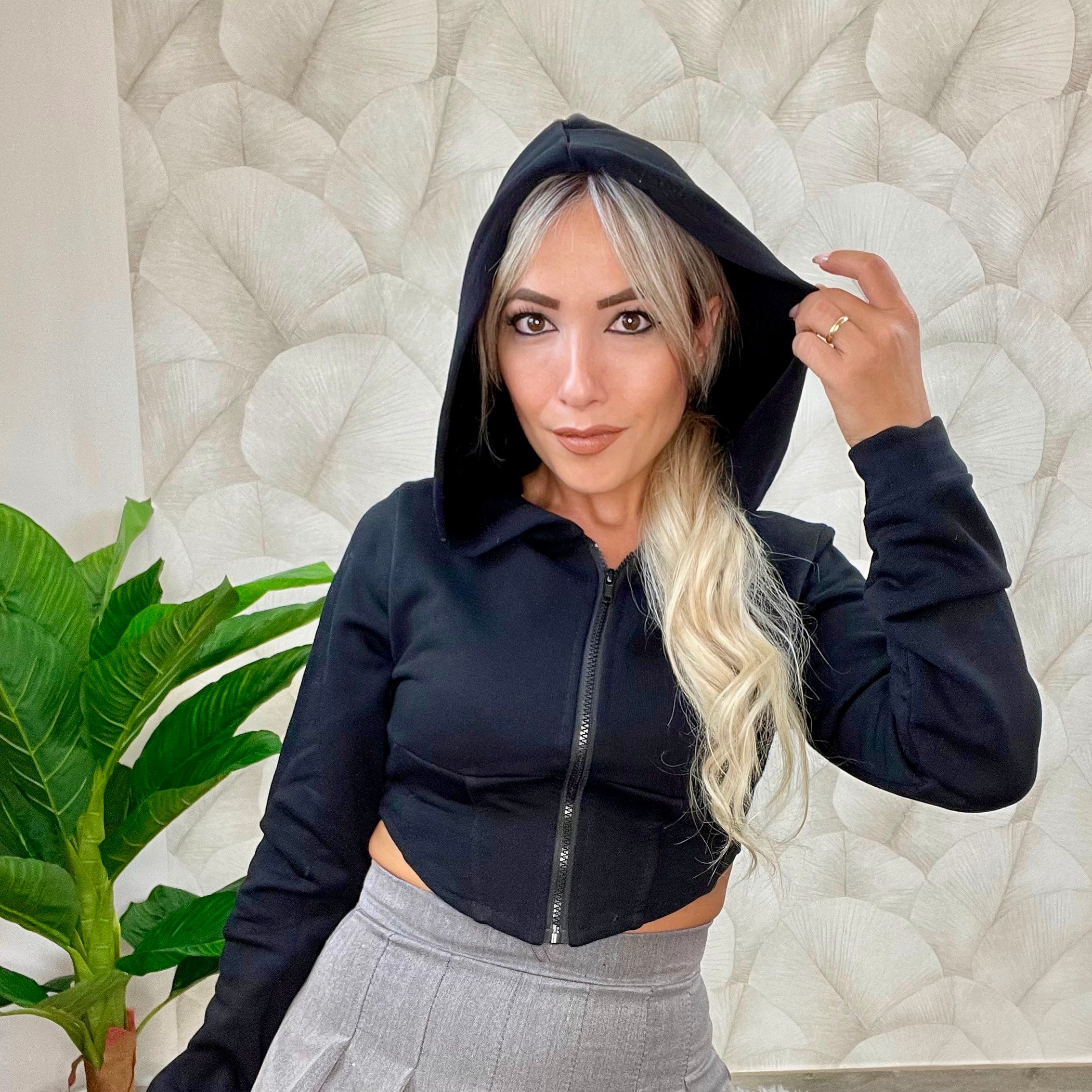 Una felpa crop con un effetto bustier sul davanti e una molla sulla parte dietro. Con zip e cappuccio.
