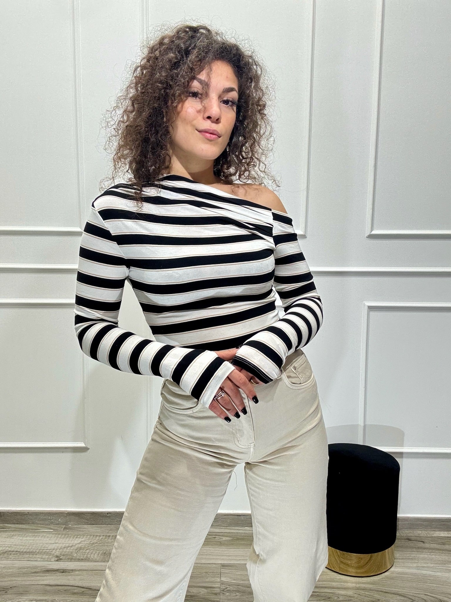 Maglia rigata in cotone elastico, scollo asimmetrico e manica a guanto
