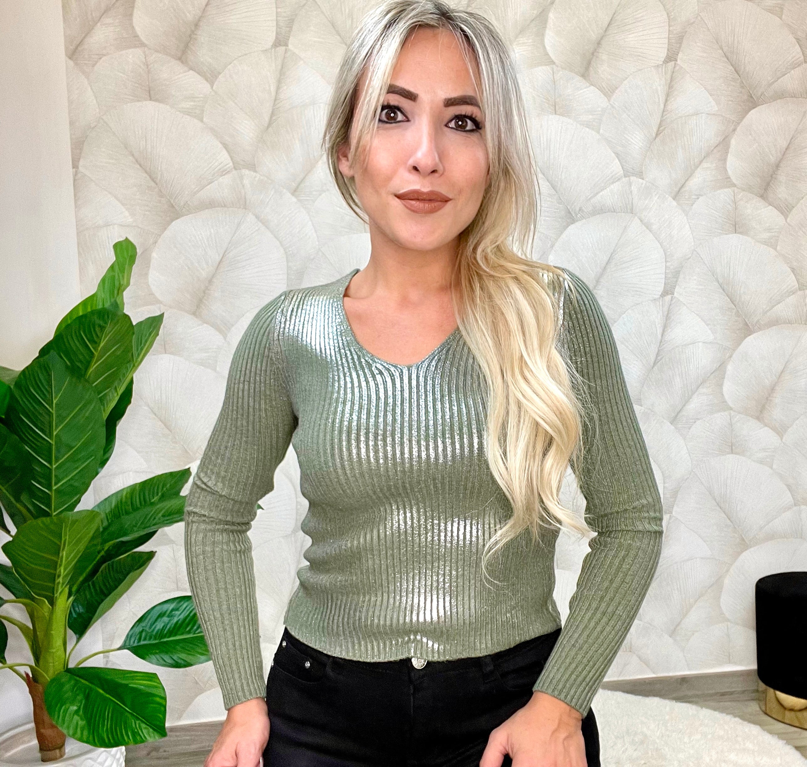 Un maglioncino a costine di lunghezza leggermente crop con una finitura metallica argento sulla parte anteriore. Tessuto elastico e vestibilità ottimale dalla XS alla L.