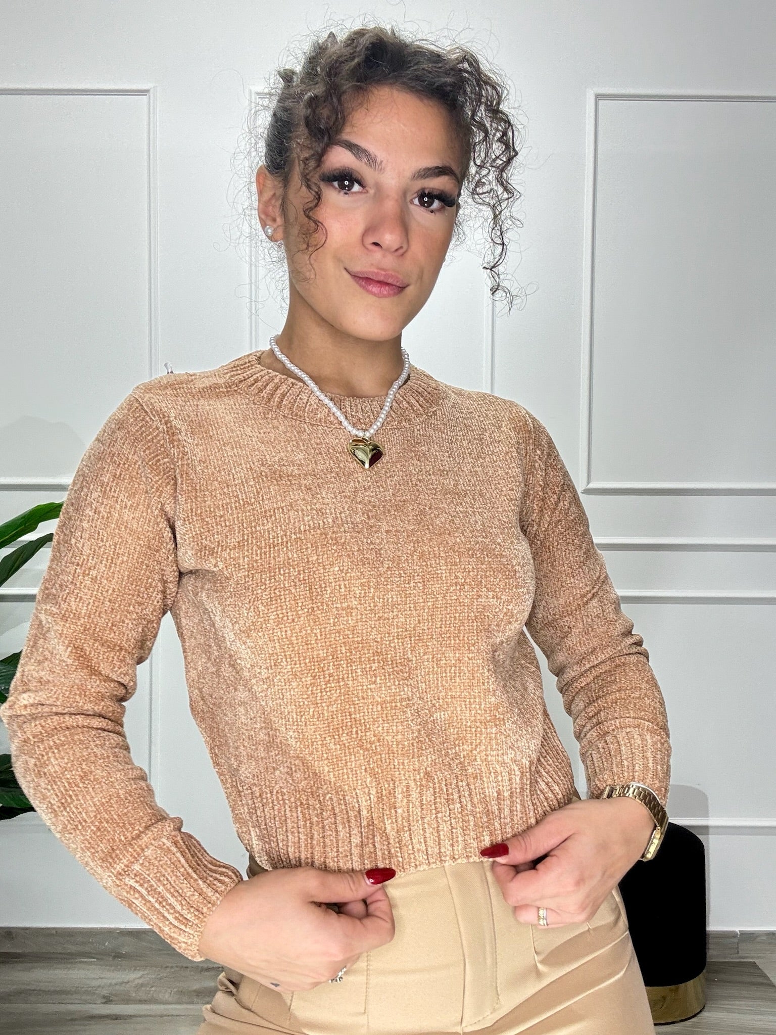 Maglioncino crop in ciniglia. Tessuto elasticizzato, disponibile in taglia unica ma con un ottima vestibilità dalla XS alla L. La modella in foto veste tg. XS.