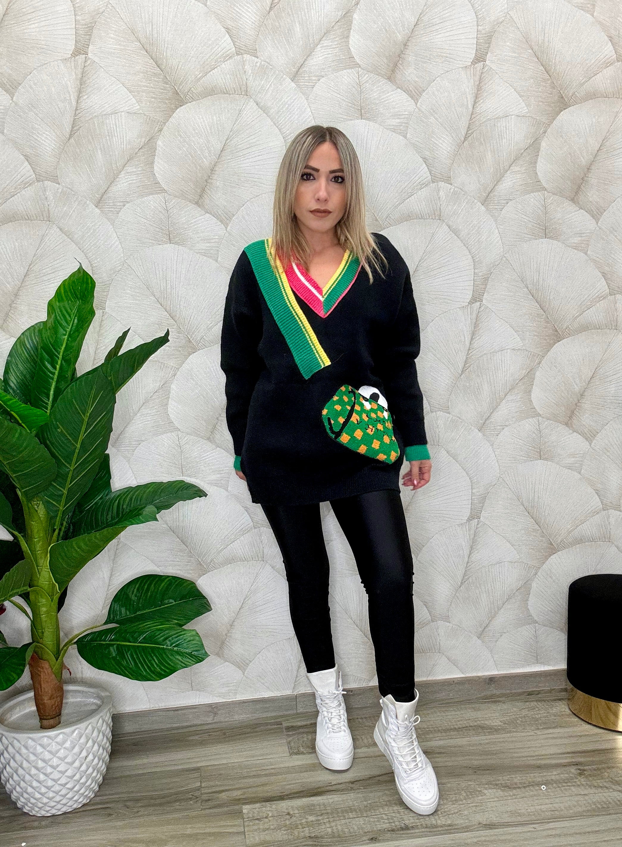 Maxi pull modello oversize in lana, scollo a punta, applicazioni sul davanti, la modella veste tg S ed è alta 165 cm.