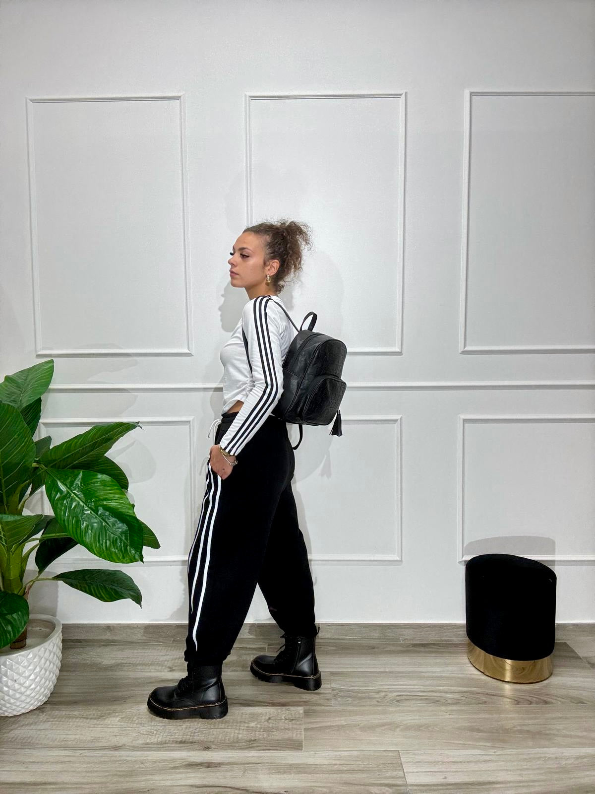 Panta tuta in cotone garzato con bande laterali modello Adidas, elastico in vita e alle caviglie. Vestibilità dalla XS alla XL, la modella in foto veste tg. S ed è alta 160 cm.