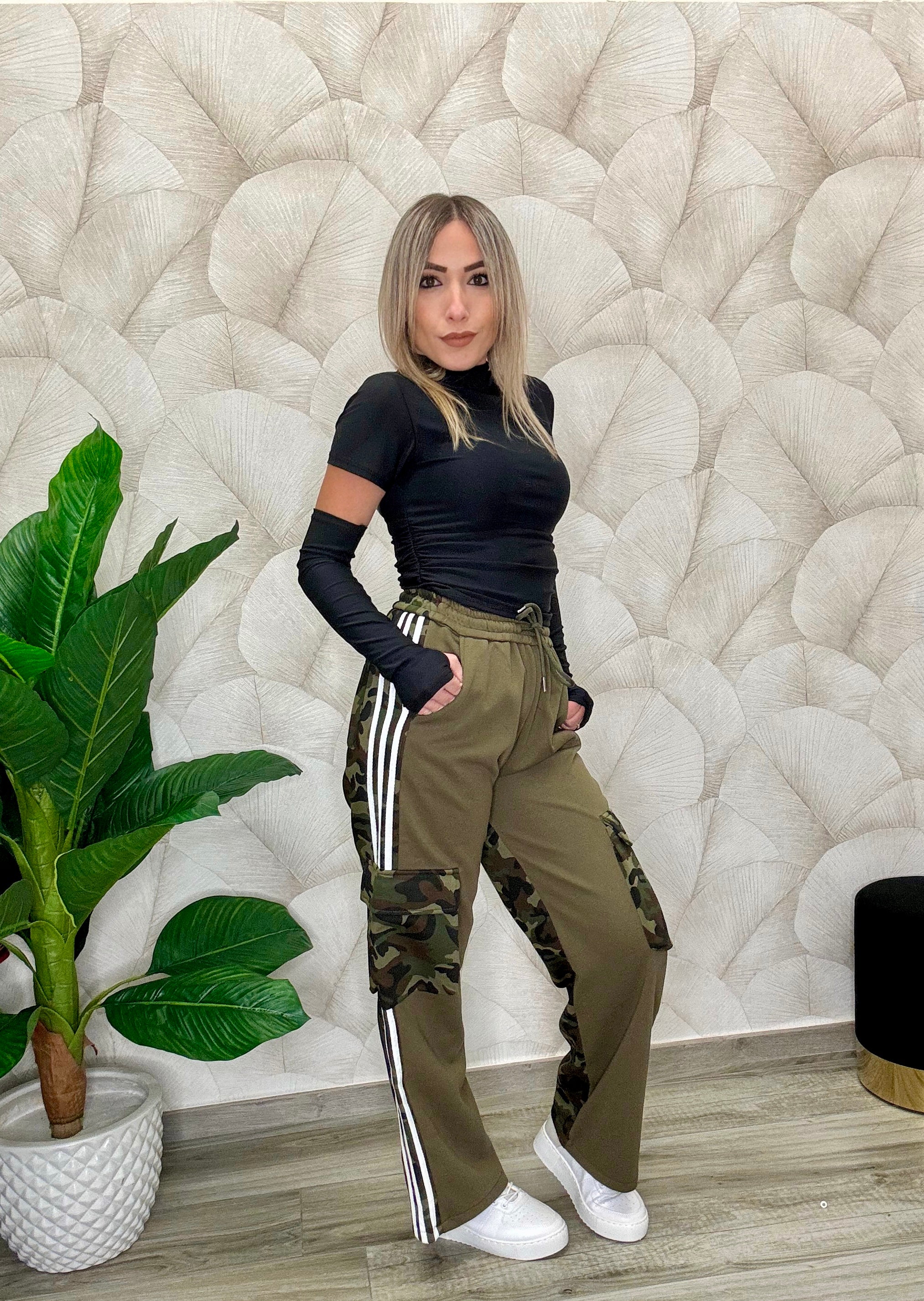Panta tuta con tasche e bande laterali. Doppio colore, il dietro è caratterizzato da fantasia mimetica, interno maxi felpa. Disponibile in taglia unica ma con un ottima vestibilita dalla XS alla L. La modella veste tg S ed è alta 165 cm