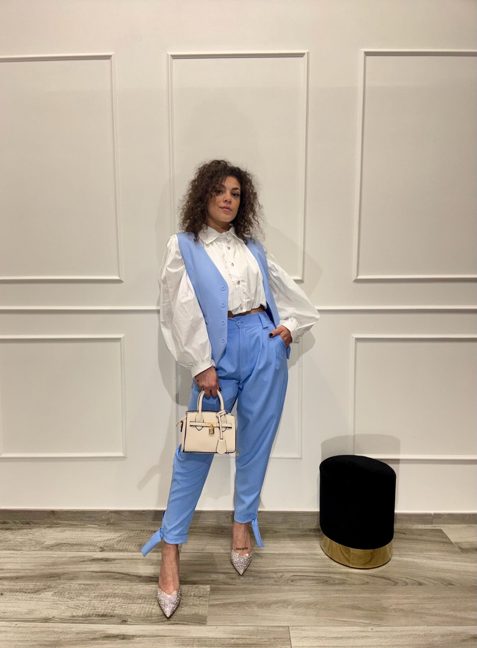Pantalone modello mom fit con pence e tasche sul davanti, larghezza caviglie regolabile, tessuto leggermente elastico