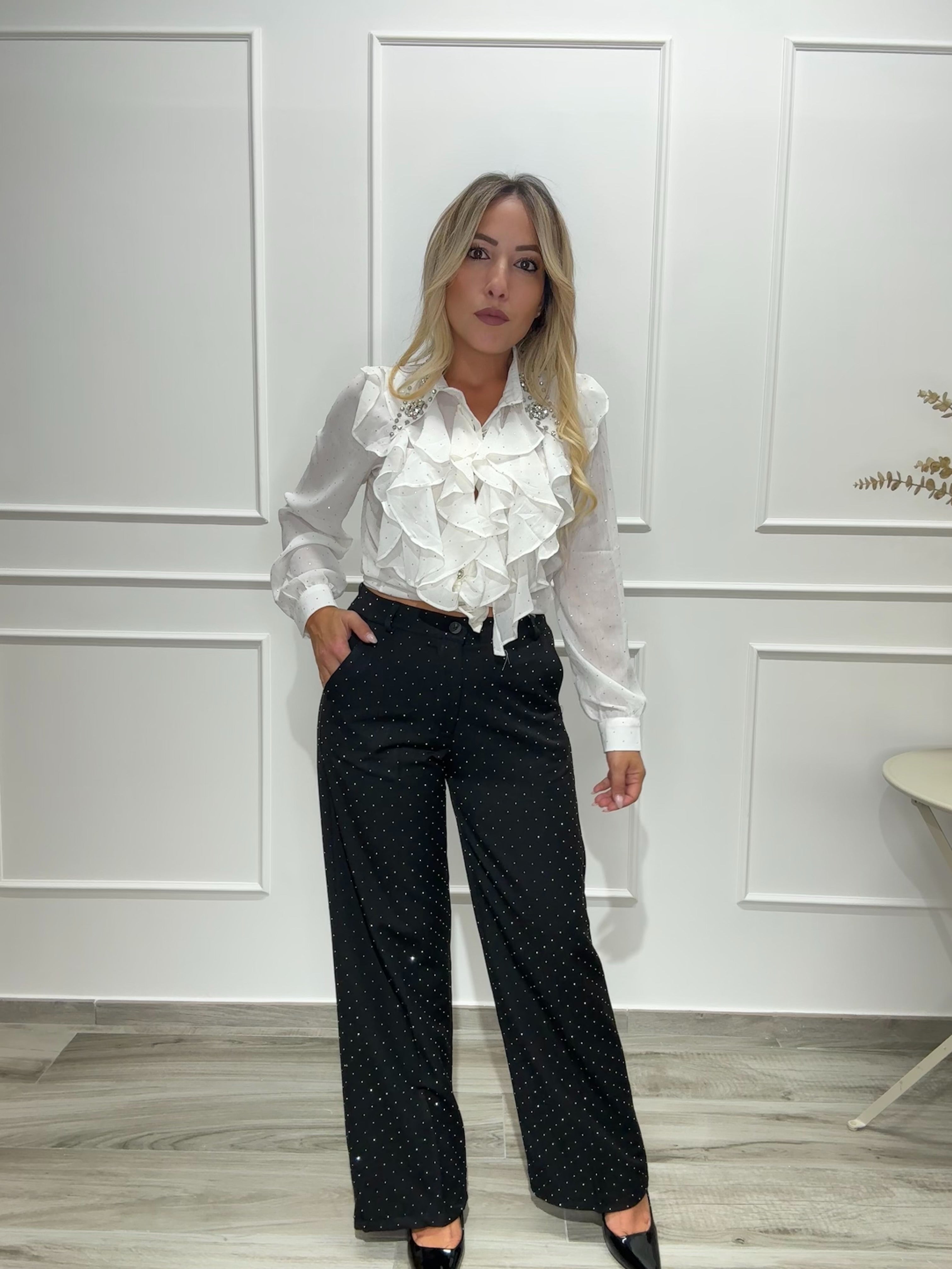 Pantapalazzo in tessuto elastico con tanche a filo ed elastico sul retro. Disponibile in taglia unica ma Con un ottima vestibilità dalla S alla L. La modella in foto veste tg. S
