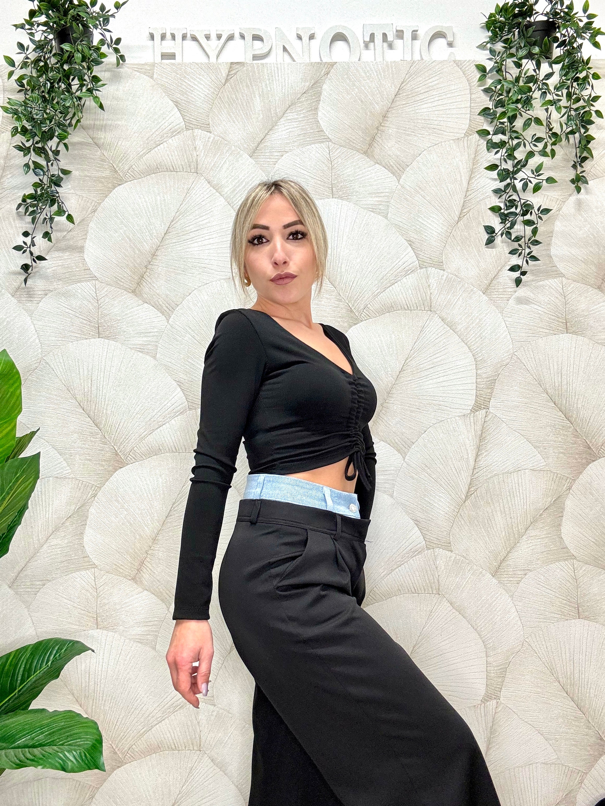 Pantalone modello palazzo, caratterizzato da doppio cinturino in tessuto denim, fermo non elastico. Disponibile in S M L. La modella in foto indossa la taglia S. Vestibilità regolare