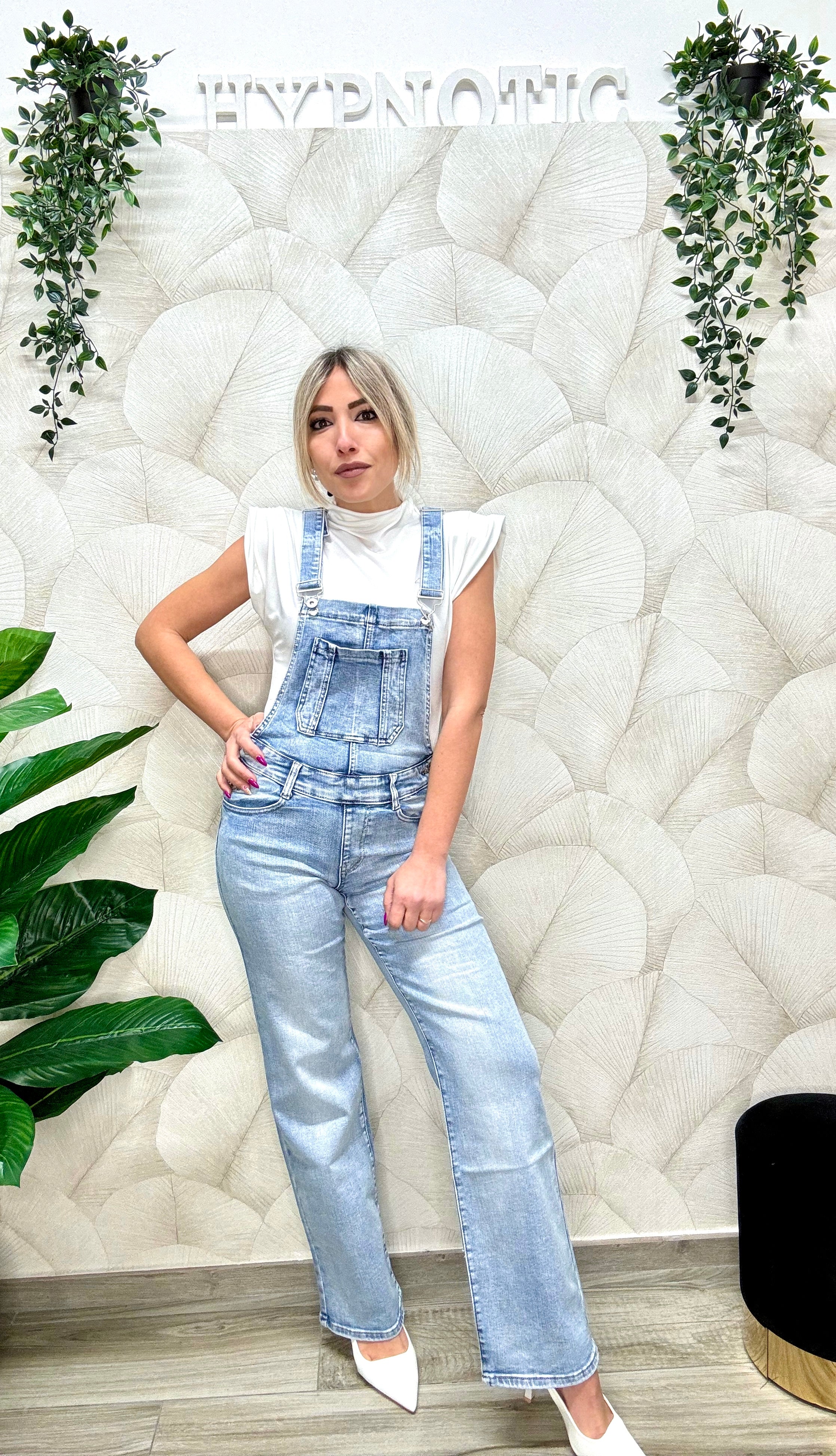 Salopette in Denim modello gamba larga con bretelle regolabili e bottoni laterali. Tessuto estremamente elastico, la modella indossa tg. XS ed è alta 165 cm.