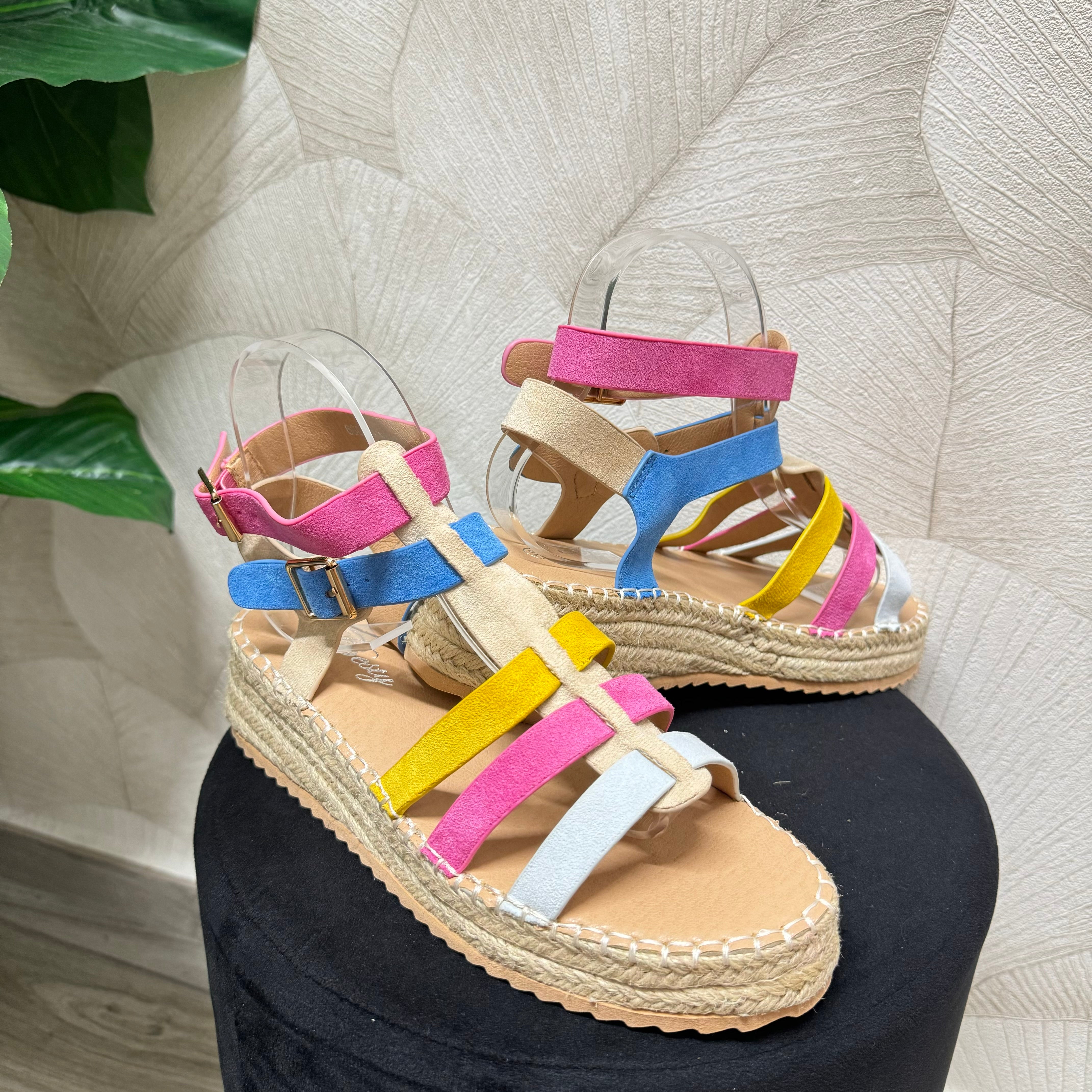 Sandalo suola paglia altezza posteriore 5 cm, con fibbie. Calzata regolare