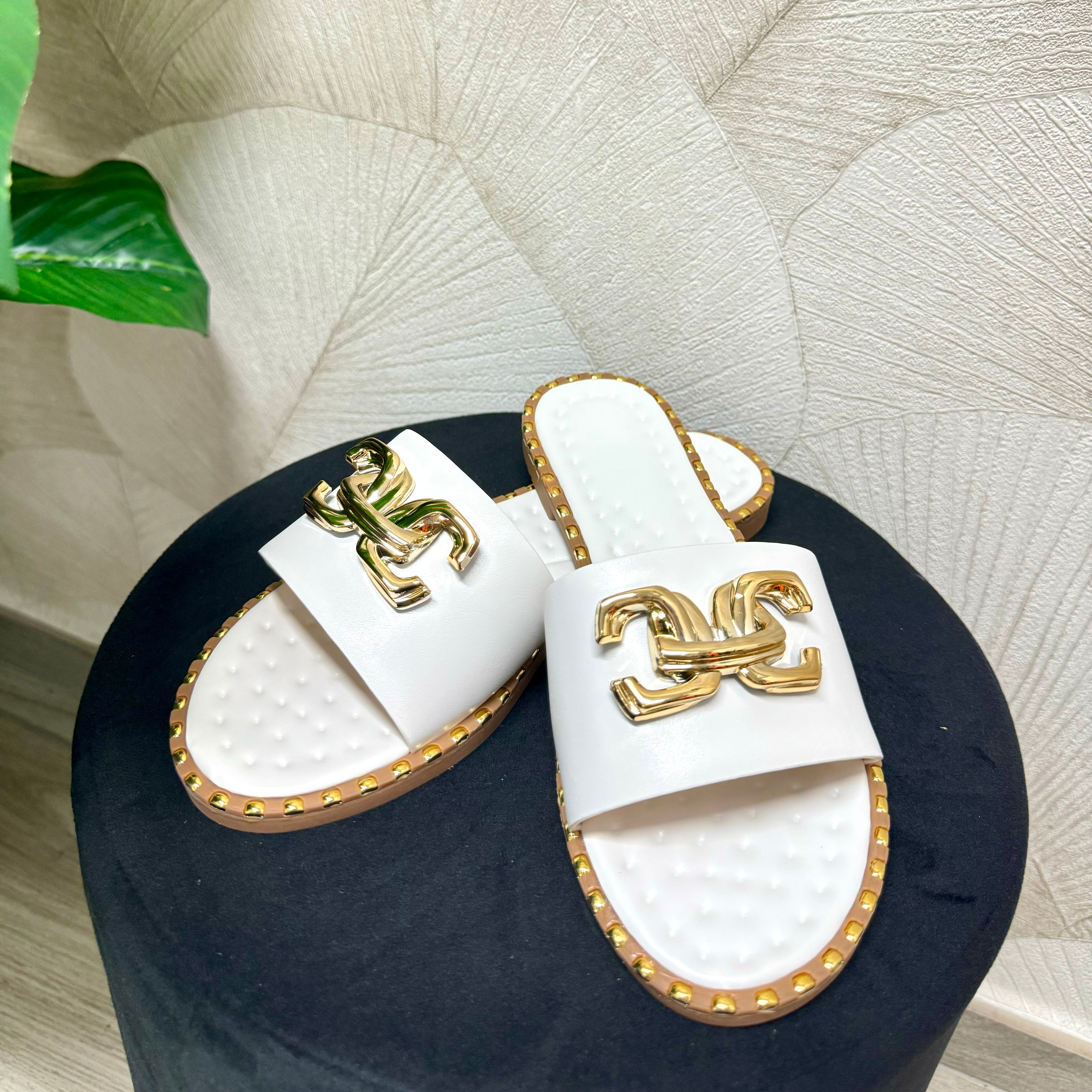 Sandalo suola bassa con applicazioni dorate. Calzata regolare
