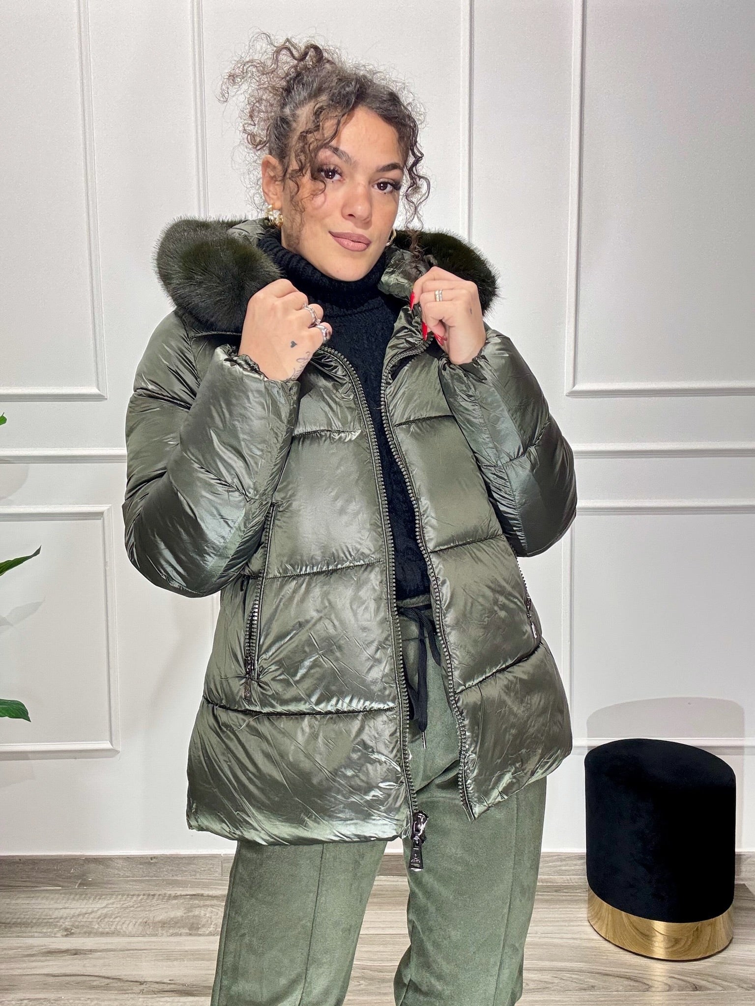 Piumino con cuciture orizzontali, adatto all’inverno. modello a campana. Vestibilità regolare. Taglie S M L XL XXL. La Modella in foto indossa tg. S