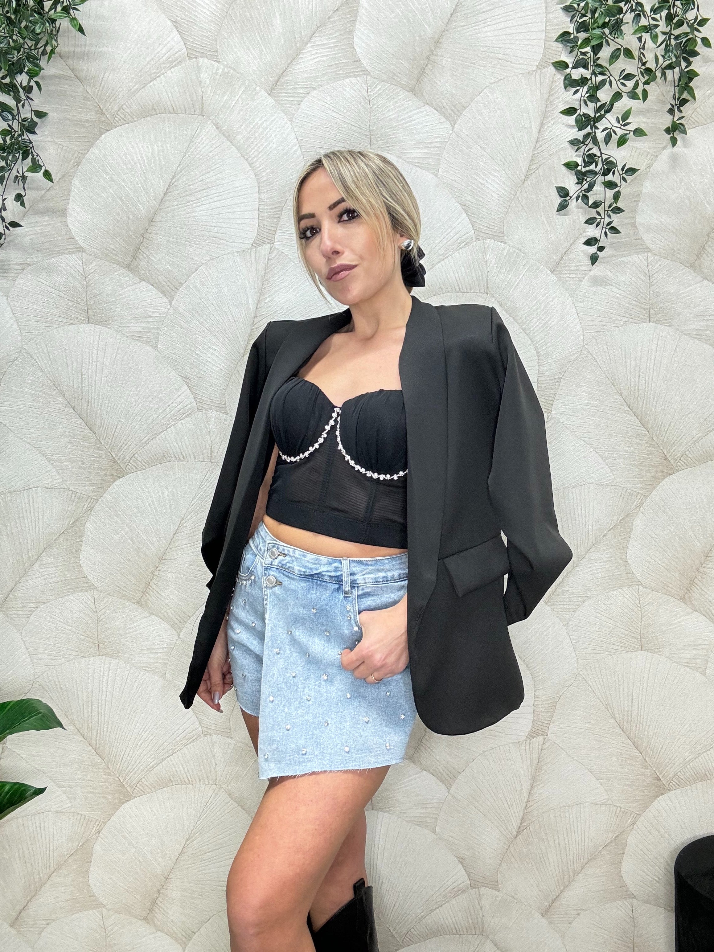 Short modello gonna in Denim con applicazioni di strass sul davanti, tessuto elastico, vestibilità regolare. Disponibile S M L. La modella in foto indossa tg S