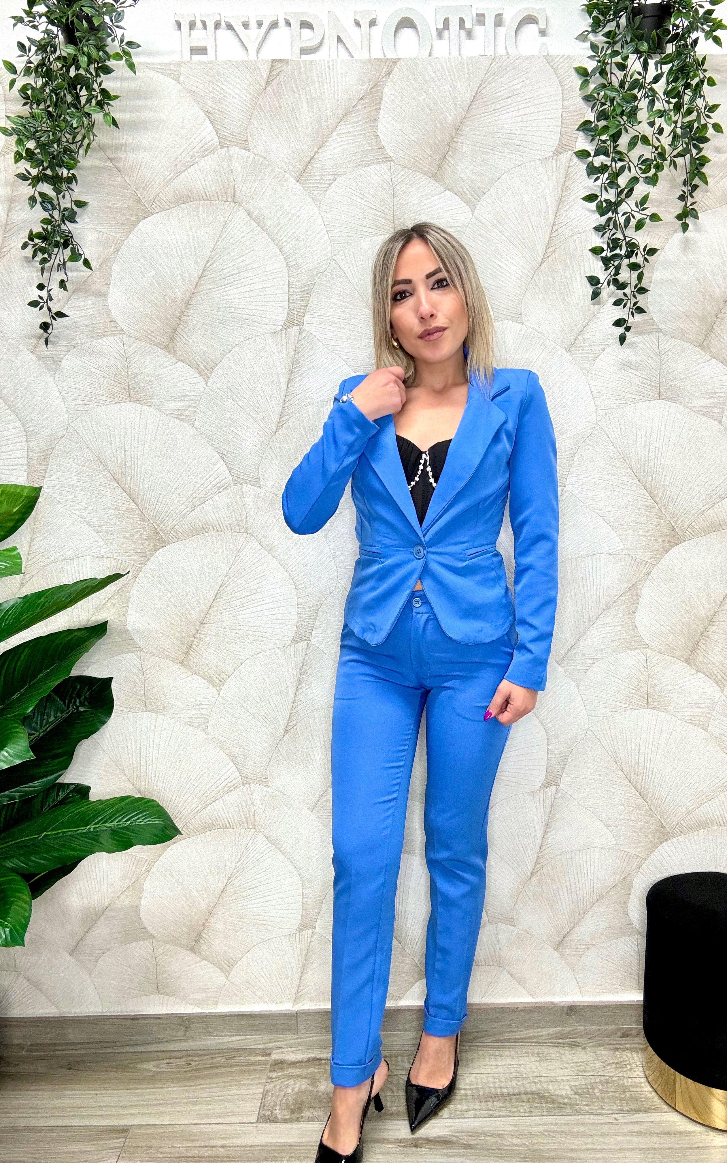 Tailleur modello slim, giacca classica avvitata e pantalone a sigaretta con risvolto. La modella in foto indossa tg. S ed è alta 165 cm.