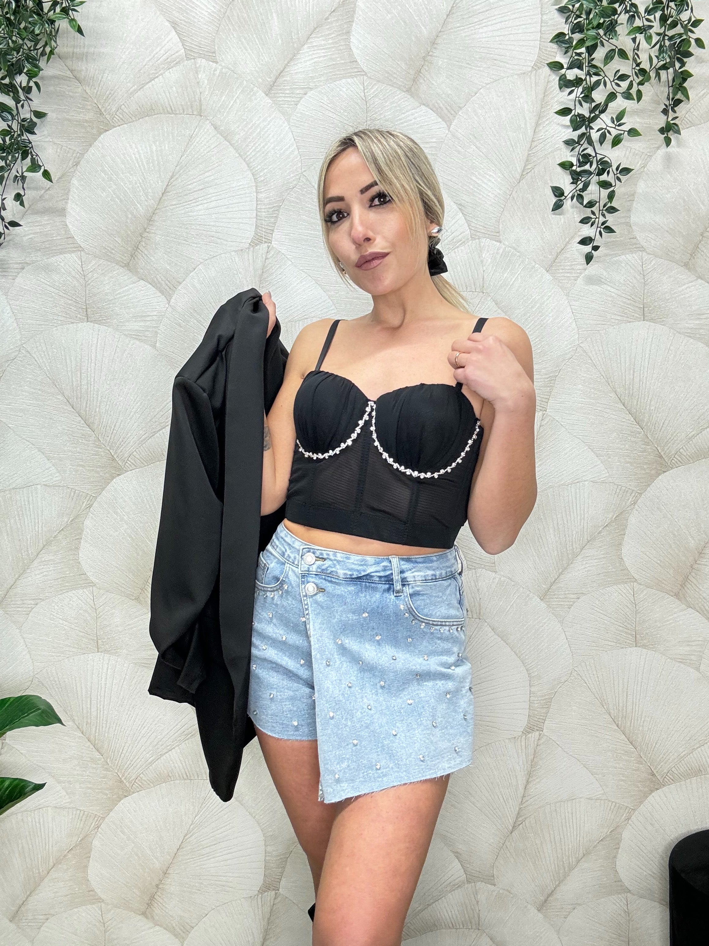 Top bustino crop velato con coppe preformate contornate da strass, bratelline regolabili e chiusura a gancio sulla parte posteriore con regolazione. Disponibile S/M ed M/L.