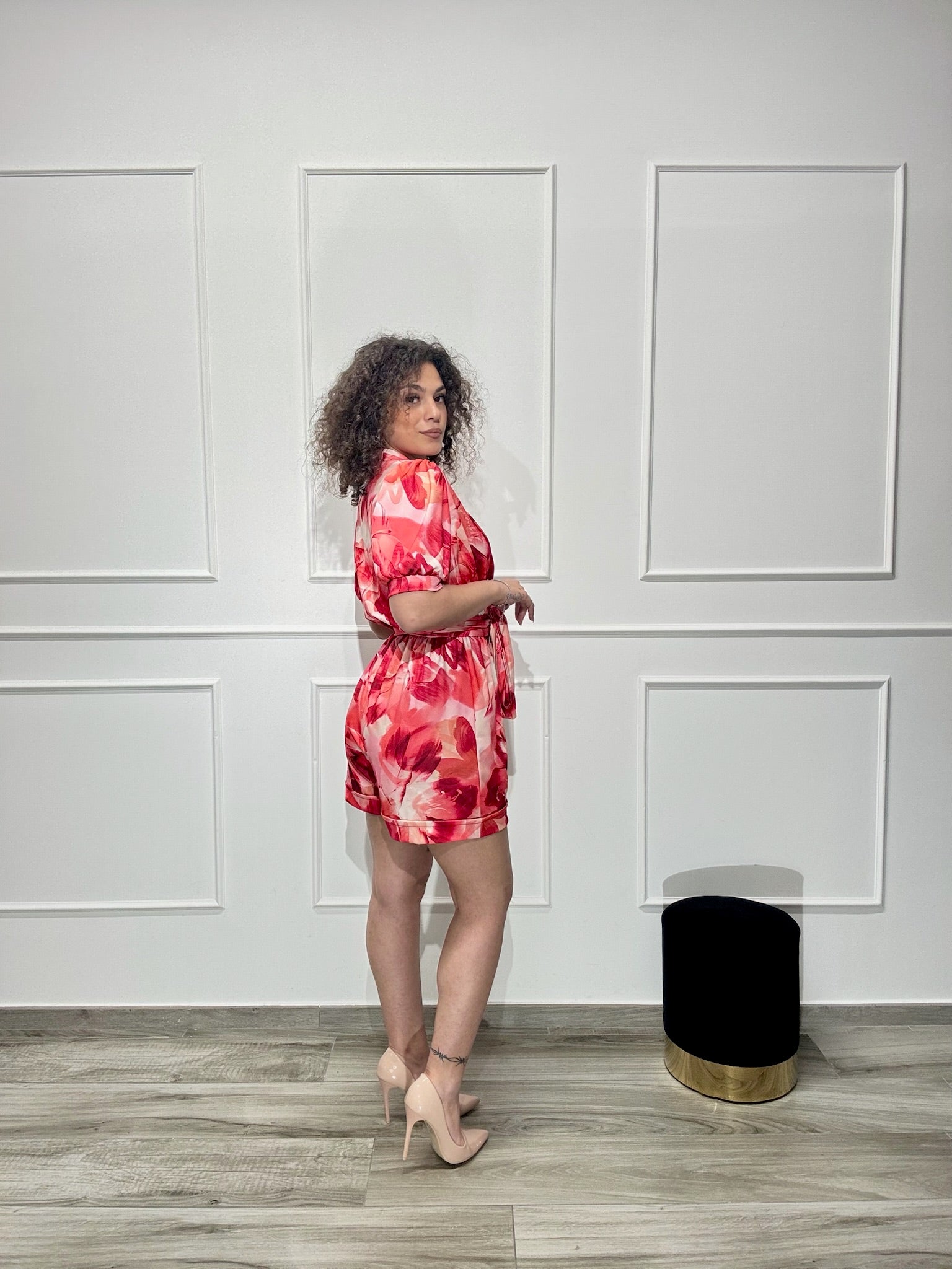 Tutina in fantasia, elastico in vita con cinturino fusciacca regolabile, manica leggermente a sbuffo