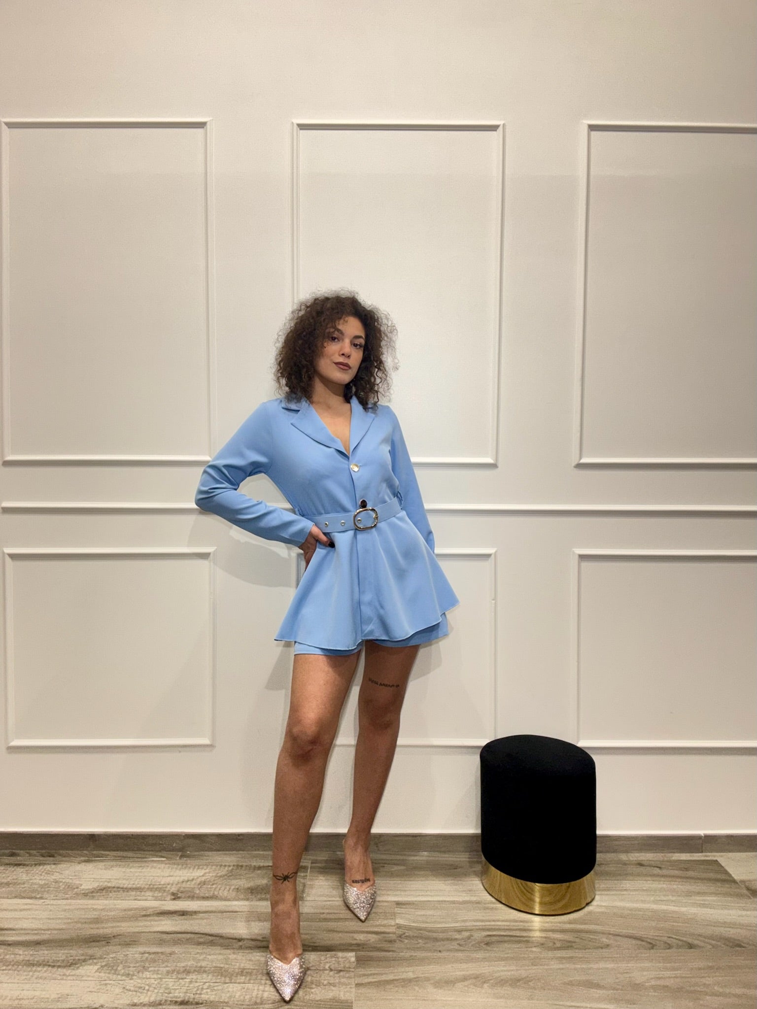 Tutina modello giacca, con elastico in vita e cintura inclusa, bottoni sul davanti.
